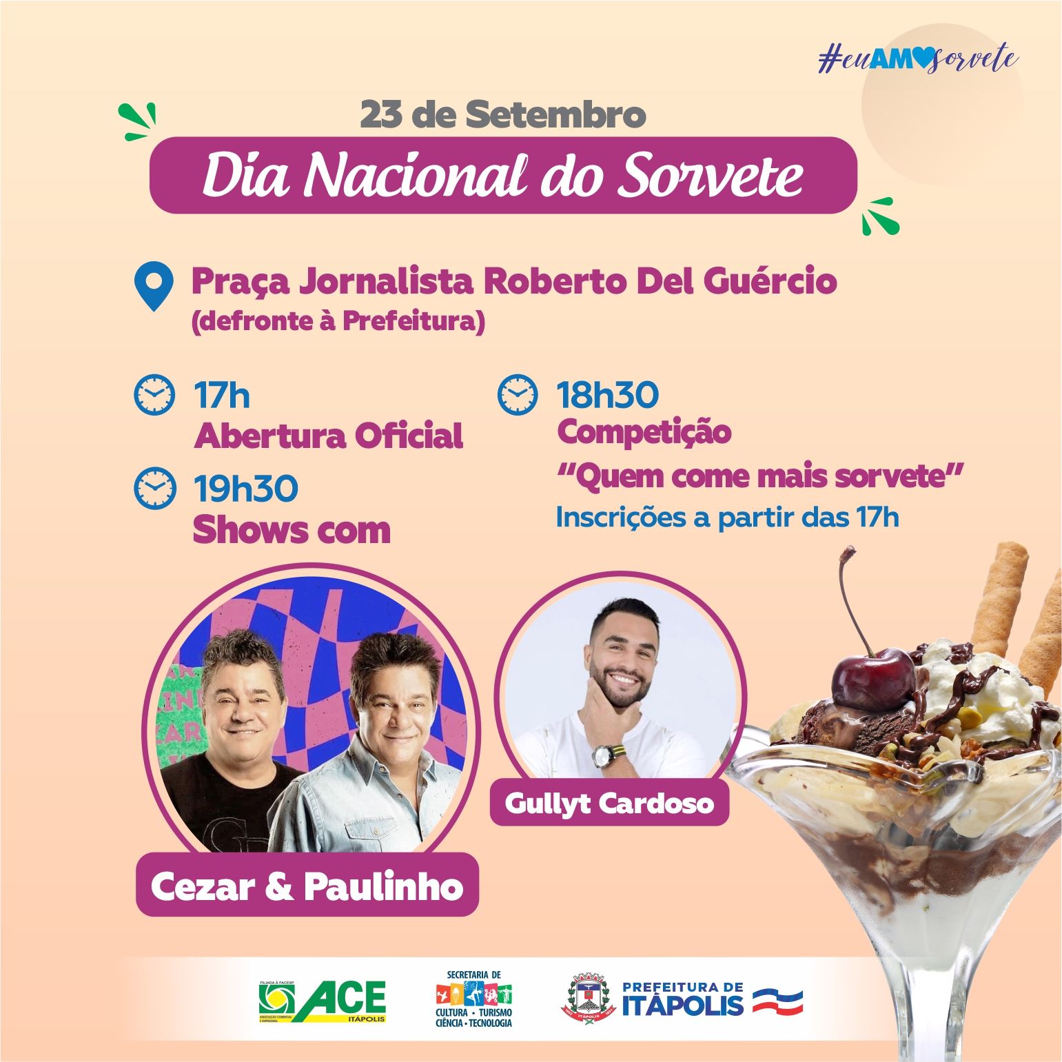 Já no dia 23, o evento terá início às 17h na Praça Jornalista Roberto Del Guércio com a abertura das inscrições para a tradicional competição "Quem come mais sorvete" seguida de um grandioso show com a dupla Cezar & Paulinho e também o show do cantor Gullyt Cardoso .