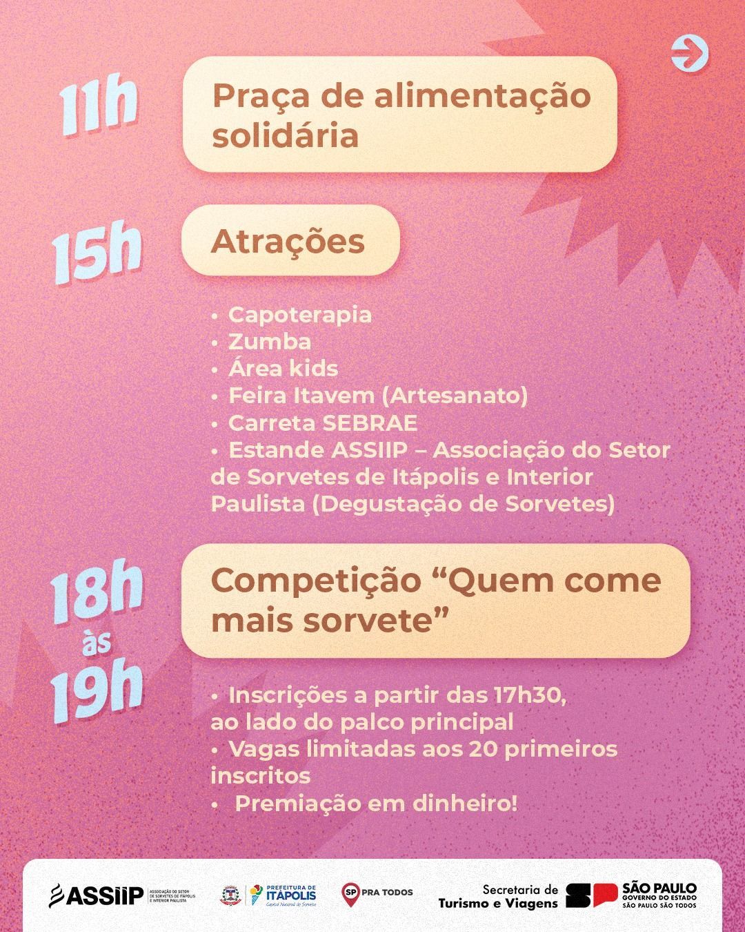 - 15h em diante – Diversas atrações: Capoterapia, Zumba, Área Kids, Feira Itavem (artesanato), Carreta SEBRAE e o estande da ASSIIP, onde o público poderá degustar sorvetes artesanais.