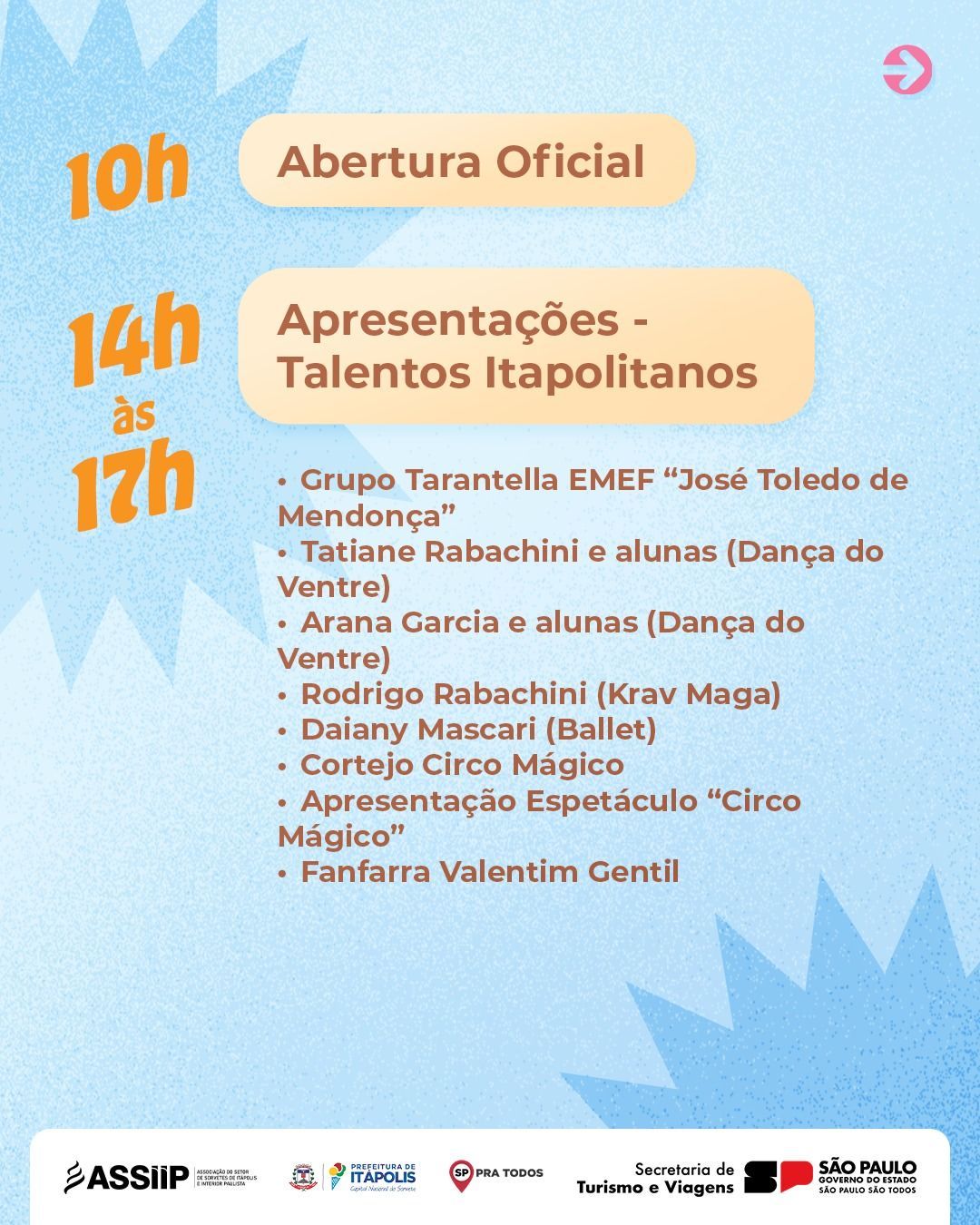 - 14h às 17h – Palco tomado pelas apresentações dos Talentos Itapolitanos, com participação do Grupo Tarantella EMEF “José Toledo de Mendonça”, Tatiane Rabachini e alunas (Dança do Ventre), Arana Garcia e alunas (Dança do Ventre), Rodrigo Rabachini (Krav Maga), Daiany Mascari (Ballet) e a tradicional Fanfarra Valentim Gentil.